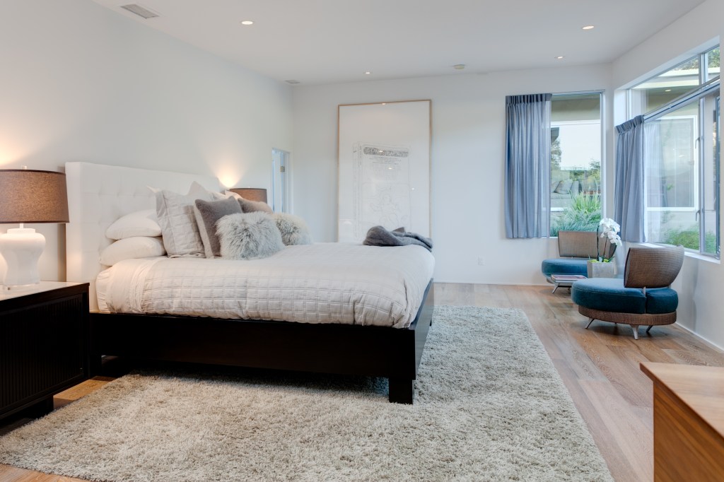With the outside complete, the inside begins. In June, I traveled to Chicago for a friend’s wedding. I stayed with the sister of the bride in her incredibly chic loft, in the city. I was amazed to see she had white painted concrete floors and I fell in love with them! Concrete paint is actually very tough – especially indoors where we are able to avoid outside elements. My family does not wear shoes inside and I found myself falling in love with the idea of an all white space – white walls, white ceiling, white floors. One of my concerns about this ADU unit was the height of the ceiling. In the main house space we have very tall ceilings – eighteen feet in out front hall, fourteen feet in our living room and nine feet in the kitchen and bedrooms. The former garage, now ADU, has only standard eight foot ceilings. Using wall to wall white will help alleviate this concern. White expands the walls and makes the walls almost fade into the ceiling. The furniture, low profile, will also help expand the feeling of vertical space.