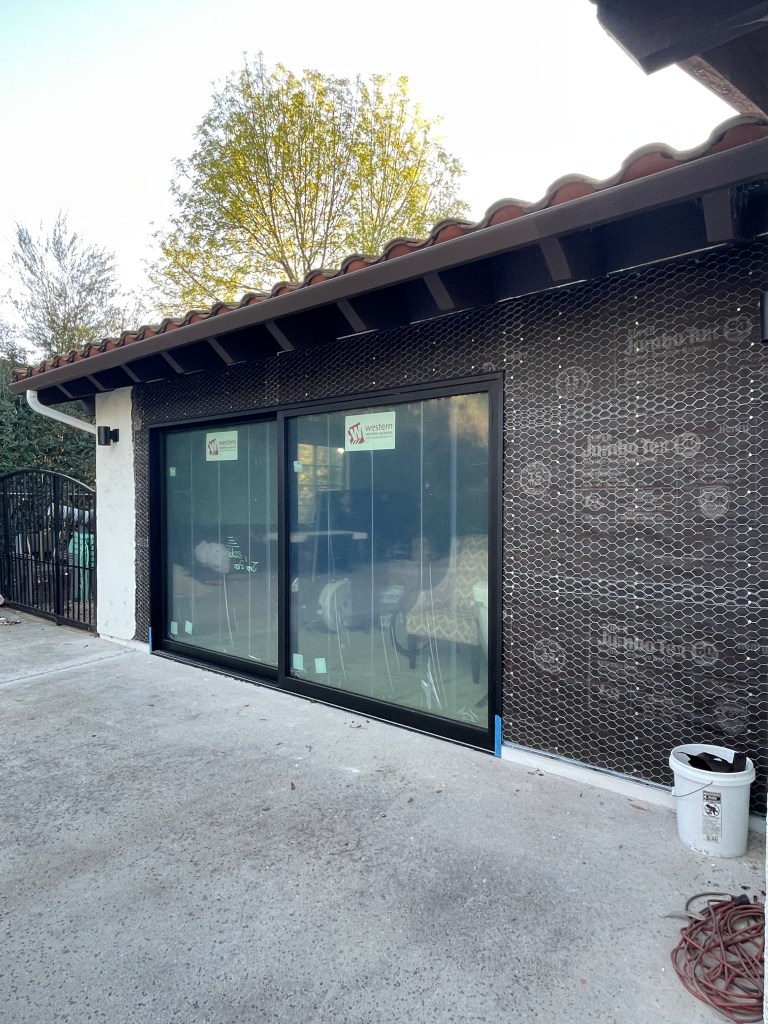 We also forgot a new door meant new stucco installation – this plywood was soon covered in protective paper and chicken wire before it was stuccoed and painted to match the house.