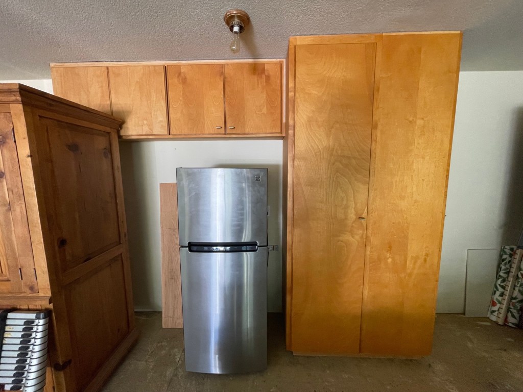 Permit applications began. It’s not easy in our small town to rush a project and it takes a few months to get the okay to begin. We rip out the garage shelving and give it to a design client who wants more storage in her garage. The cabinets are in great shape, but in an attempt to get rid of that “garage feel” we want to start fresh with an empty space.
