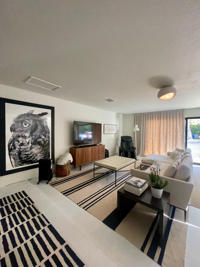 What a transformation! After painting, we installed custom drapery to match what we have in the rest of the house, new rugs, a B&B Italia Sectional, Ottoman, Wabi-Sabi ceiling light, some of our favorite artwork (Jennifer MaHarry, Bob Larkin art pictured above) and the television, now no longer in the living room! The kids have already claimed the space for this weekend with a long list of films they will be screening.